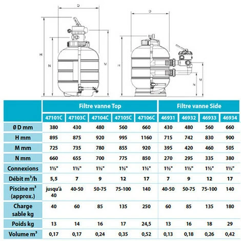Filtres moulés par soufflage en une seule pièce sans union, ni soudure. Fabriqués en résine plastique inaltérable par les agents chimiques et atmosphériques. Ouverture aisée du couvercle. Equipés d’un manomètre, de purges d’air et d’eau manuelles et d’une vanne multivoies. Couleur ivoire. Pression maximale de 2,5 kg/cm2 pour filtres Ø 380 mm, Ø 430 mm et Ø 480 mm, et de 2 kg/cm2 pour filtres Ø 560 mm et Ø 660 mm. Vanne 1″1/2.