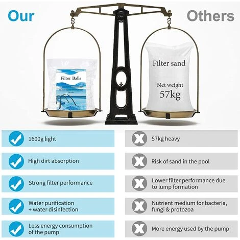 Large gamme d’applications : Les boules filtrantes sont fabriquées à partir de filaments de fibres et conviennent à tous les systèmes de filtration à sable standard et peuvent également remplacer le sable de filtration. Elles conviennent aux piscines, aquariums, pompes de filtration, aquariums, pompes de filtration à sable, systèmes de filtration à sable, ainsi qu’à l’eau douce et à l’eau de mer.