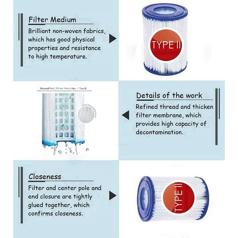 Durable:Filtre de piscine de type 2, durable et lavable, le tissu plissé conserve sa résistance même en cas de chargement avec des sédiments. Le noyau à haut débit supporte le filtre. Les matériaux épais ne peuvent pas être facilement détruits. Assurez-vous que la pompe est nettoyée normalement.