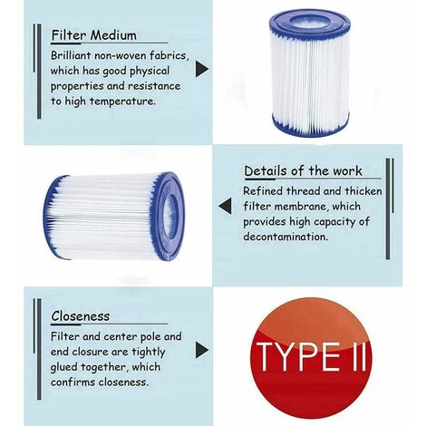 Taille : ce filtre est spcialement conu pour Bestway Type II. Dimensions du filtre de piscine : environ Diamtre extrieur : 106 mm – Diamtre intrieur : 52 mm – Hauteur : 136 mm – Veuillez confirmer votre modle de pompe avant l’achat. .